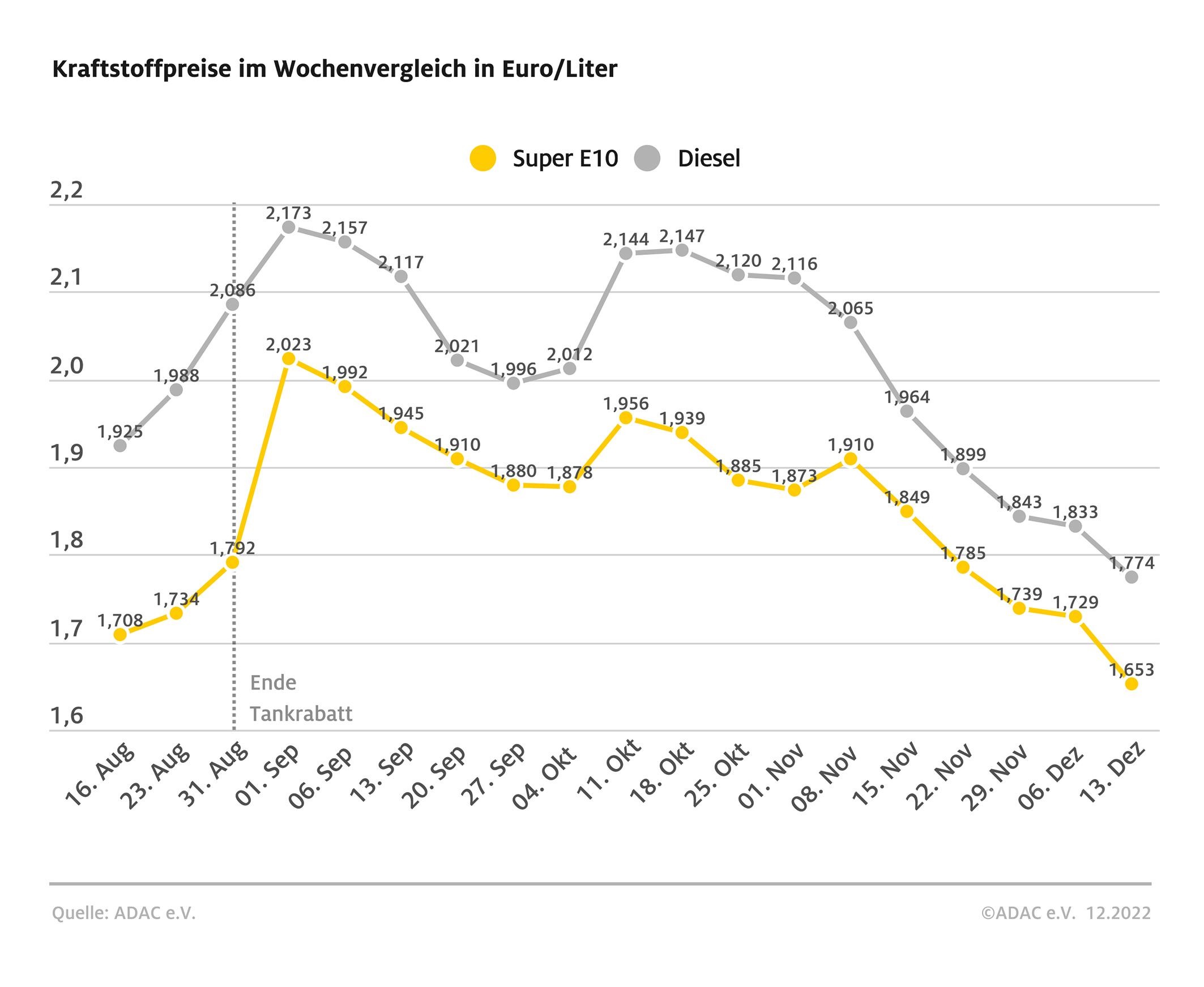 München (ots) – Eine gute Nachricht für die Autofahrer: Tanken hat sich im Vergleich zur Vorwoche weiter deutlich verbilligt – dies zeigt die aktuelle ADAC Auswertung der Kraftstoffpreise in Deutschland. Danach kostet ein Liter Super E10 im bundesweiten Schnitt 1,653 Euro, das ist ein Minus von 7,6 Cent. Ebenfalls spürbar günstiger ist Diesel-Kraftstoff: Für einen Liter muss man derzeit im Mittel 1,774 Euro bezahlen, das sind 5,9 Cent weniger als vor einer Woche.