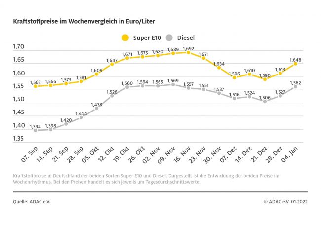 München (ots) – Das neue Jahr startet mit einem Anstieg der Spritpreise. Das ermittelt der ADAC in seinem wöchentlichen Preisvergleich. Demnach kostet ein Liter Super E10 im bundesweiten Mittel 1,648 Euro. Das entspricht einem Anstieg von 3,5 Cent im Vergleich zur Vorwoche. Ein Liter Diesel kostet aktuell an den Zapfsäulen im Bundesschnitt 1,562 Euro –…