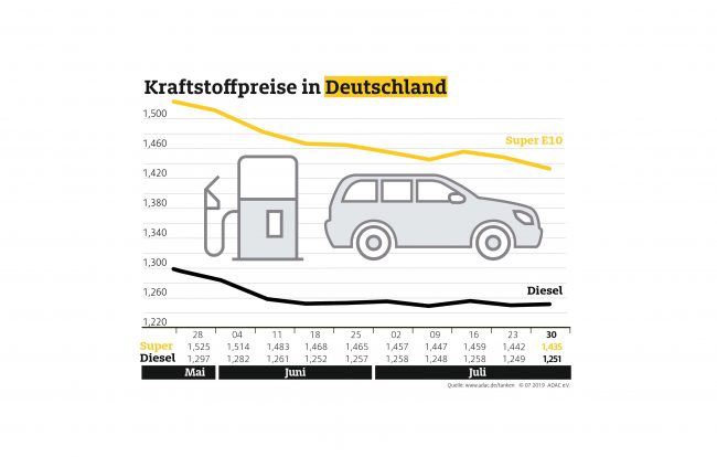 München (ots) Der Rückgang der Kraftstoffpreise setzt sich fort. Autofahrer konnten im Juli den zweiten Monat in Folge billiger tanken. Laut der monatlichen Marktauswertung des ADAC kostete ein Liter Super E10 im Monatsmittel 1,448 Euro und damit 3,0 Cent weniger als im Juni. Diesel verbilligte sich gegenüber dem Vormonat um 0,9 Cent auf durchschnittlich 1,252 Euro…