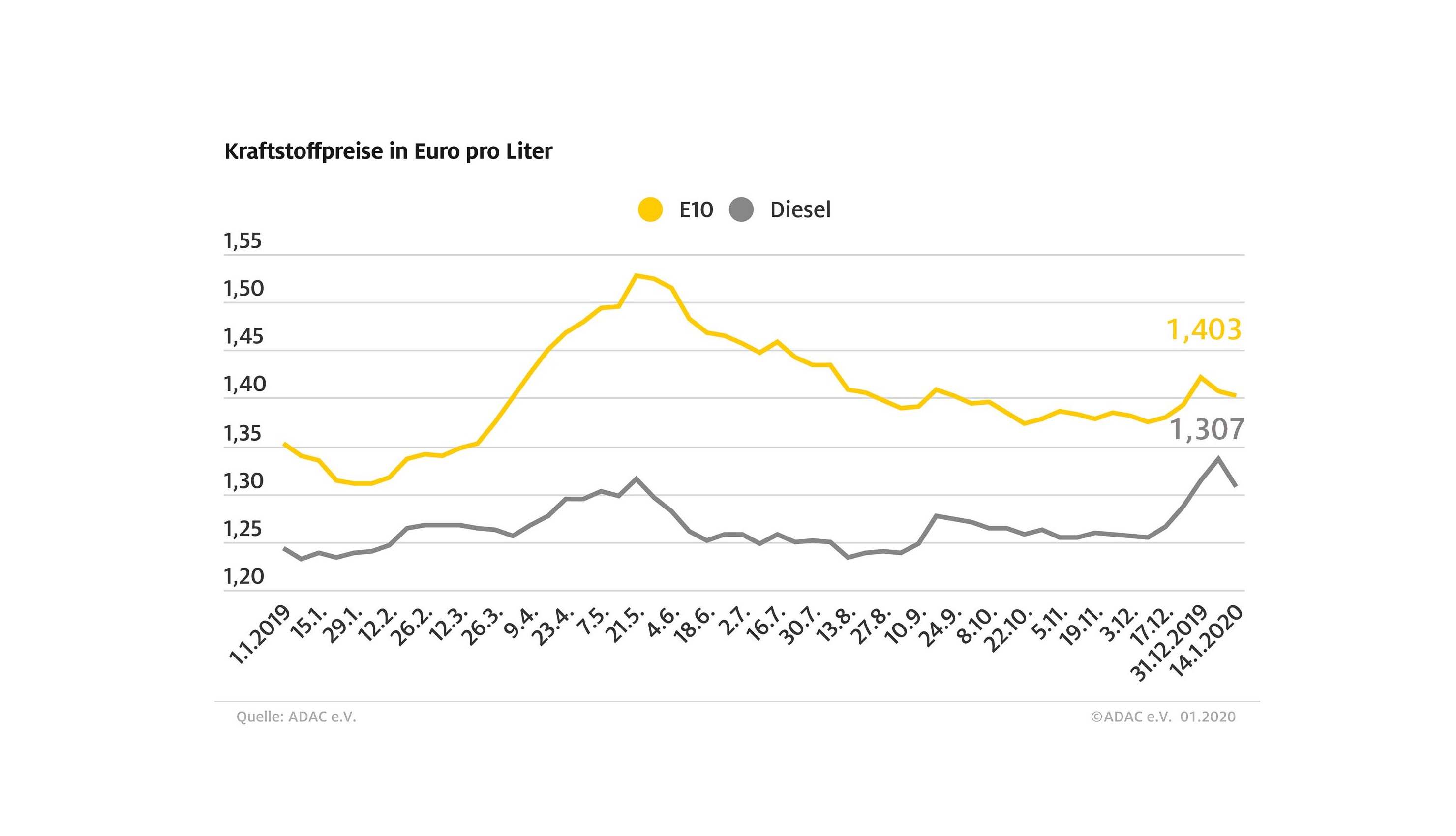 Autofahrer müssen für Benzin und Diesel weniger als in der Vorwoche bezahlen. Besonders kräftig verbilligte sich Diesel. Laut aktueller Auswertung des ADAC sank der Preis für einen Liter angesichts der milden Temperaturen um 2,9 Cent auf durchschnittlich 1,307 Euro. Ein Liter Super E10 kostet im Bundesmittel derzeit 1,403 Euro, ein Rückgang um 0,4 Cent gegenüber der Vorwoche. Die mittlere Preisdifferenz zwischen beiden Kraftstoffsorten stieg dadurch wieder auf 9,6 Cent.