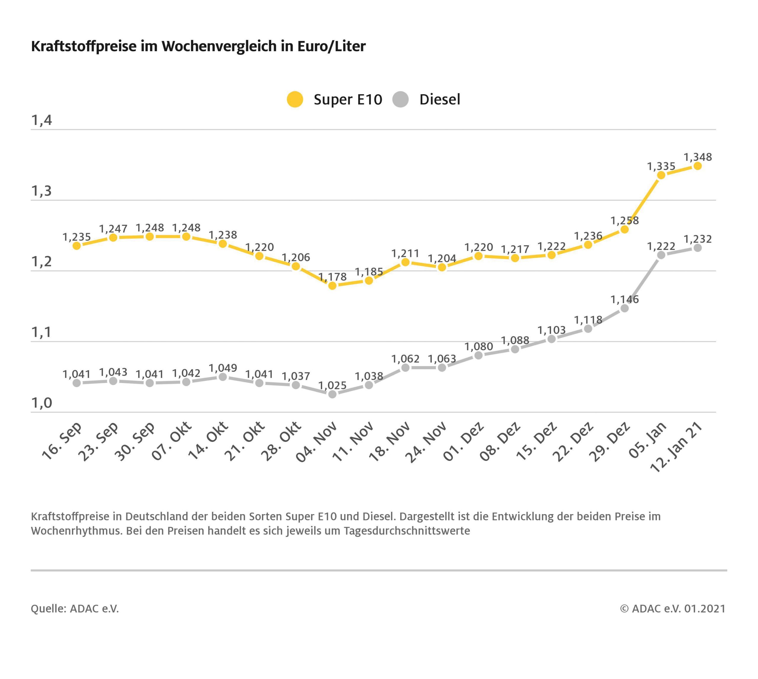 Die Kraftstoffpreise in Deutschland sind im Vergleich zur vergangenen Woche leicht gestiegen. Der Preis für einen Liter Super E10 kletterte um 0,6 Cent auf 1,354 Euro im bundesweiten Durchschnitt. Diesel verteuerte sich binnen Wochenfrist um 0,5 Cent und kostet derzeit im Schnitt 1,237 Euro. Dies zeigt die wöchentliche ADAC Auswertung der Kraftstoffpreise.