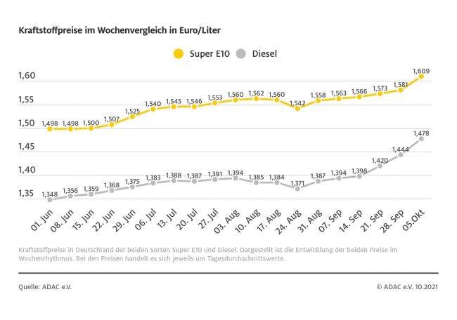 München (ots) Tanken wird zurzeit immer teurer: Für einen Liter Super E10 müssen die Autofahrer derzeit im bundesweiten Mittel 1,609 Euro bezahlen – das sind 2,8 Cent mehr als in der vergangenen Woche. Noch stärker ist der Preis für Diesel gestiegen. Ein Liter kostet aktuell 1,478 Euro und liegt damit um 3,4 Cent über dem…