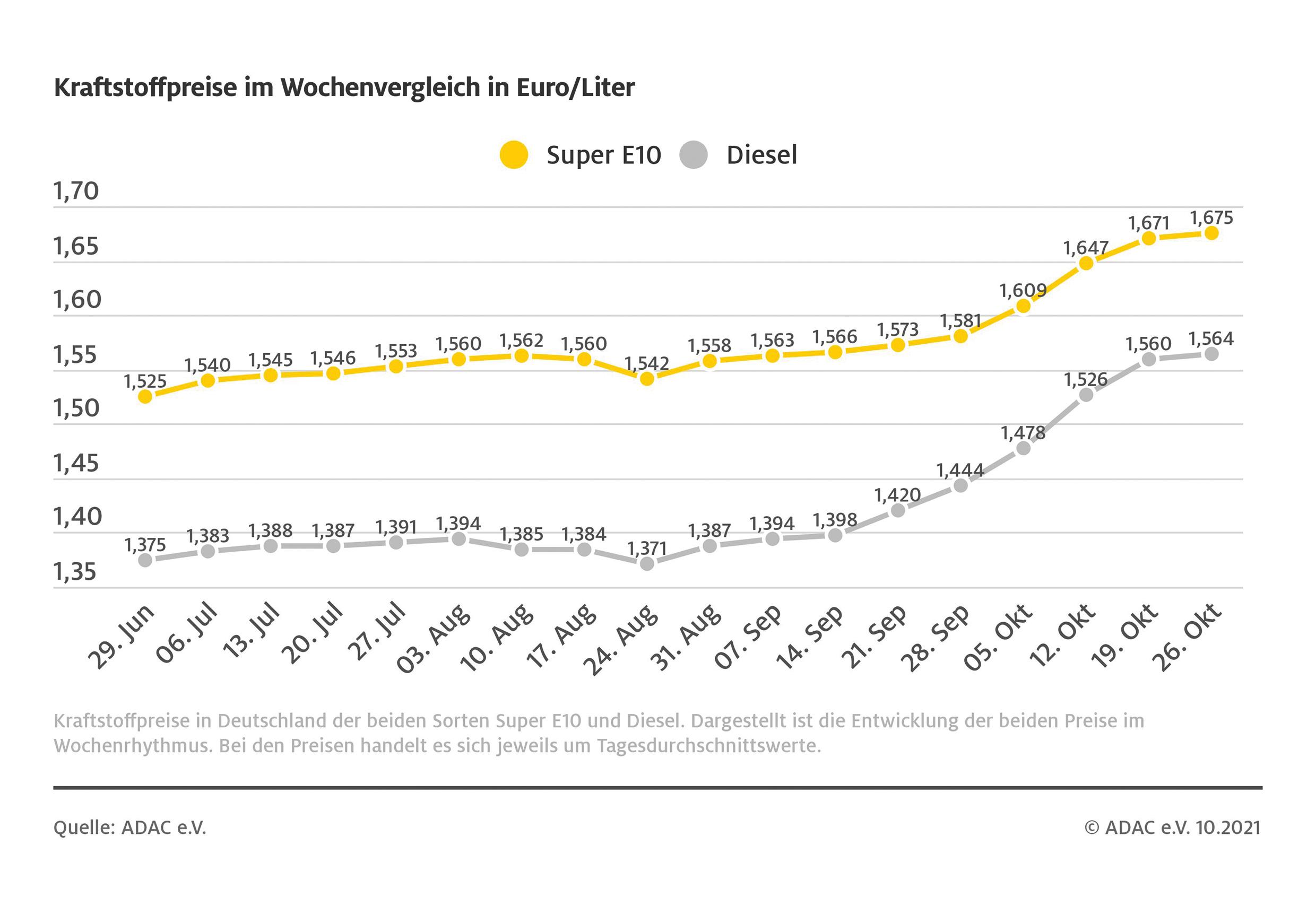 Kraftstoffpreise im Wochenvergleich. Quelle: ADAC