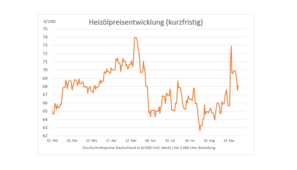Hinweis: Die genannten Heizölpreise beziehen sich stets auf den deutschlandweiten Durchschnittspreis bei einer Bestellung von 3.000 Liter Heizöl Standard schwefelarm inklusive 19% MwSt.. Durch Transportkosten fallen die Preise regional jedoch unterschiedlich aus. Die Preisspanne zwischen den Regionen kann daher momentan bei bis zu ca. 3,09 Euro pro 100 Liter liegen. Stand der Preise: 27.09.2019